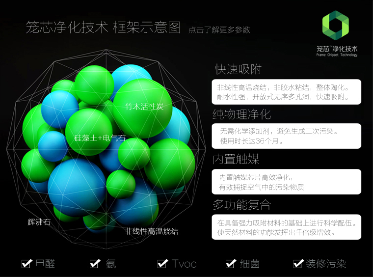 “籠芯凈化”技術(shù)是桂林良物造日用品有限公司、新竹大自然生物材料有限公司攜手中日產(chǎn)學(xué)研戰(zhàn)略聯(lián)盟研發(fā)的一種新型生態(tài)健康環(huán)保技術(shù)。以“籠芯凈化”技術(shù)為核心,主體采用活性多孔質(zhì)微晶竹炭、超活化備長(zhǎng)炭、活化硅藻土、電氣石、沸石分子篩等功能型天然植物礦物材料,通過(guò)非線性高溫?zé)Y(jié)工藝,使材料內(nèi)具備快速、強(qiáng)大的吸附性能,可有效捕捉空氣中的污染物質(zhì),以及水和土壤中的毒害物質(zhì)并將其鎖定在籠形結(jié)構(gòu)內(nèi),然后通過(guò)在籠形結(jié)構(gòu)內(nèi)置的觸媒芯片對(duì)VOC等毒害物質(zhì)進(jìn)行催化分解。