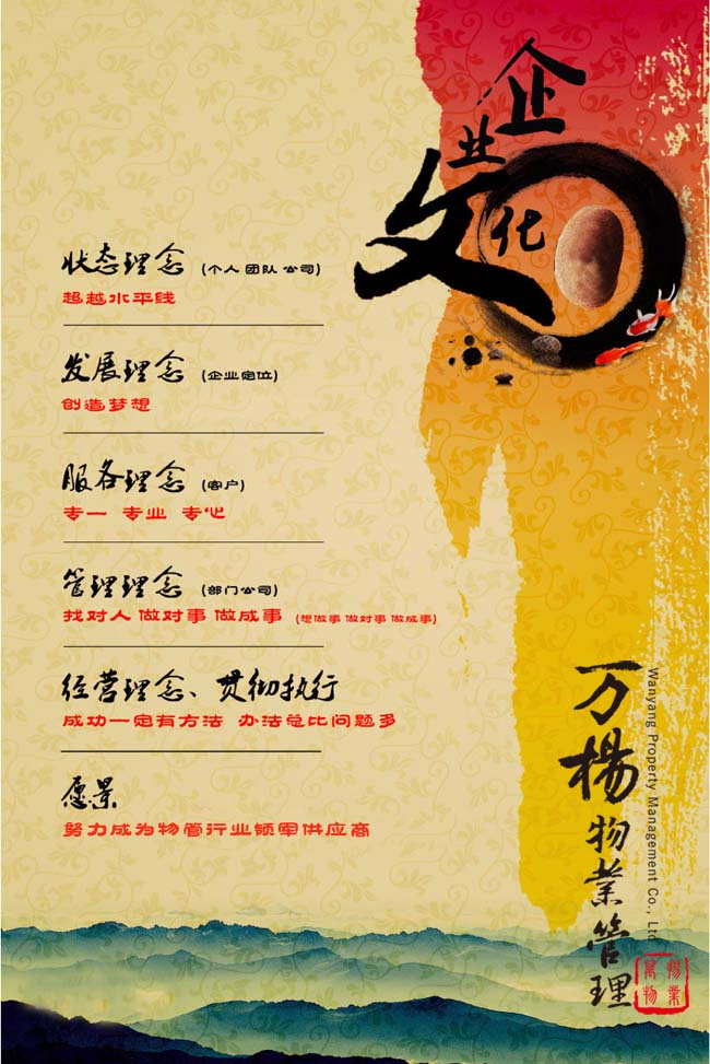 我們的企業(yè)是一個(gè)充滿活力,奮發(fā)向上的團(tuán)體,我們的宗旨是創(chuàng)造一個(gè)優(yōu)秀的物業(yè)管理企業(yè),為業(yè)主提供滿意和高尚的服務(wù)品質(zhì),我們將每一位員工都看成我們事業(yè)的重要組成部分,企業(yè)以擁有你們這些員工為榮。因此,我們希望我們的員工都能盡善其職,愿我們的每一位員工都能以自己是“萬楊人”而驕傲。