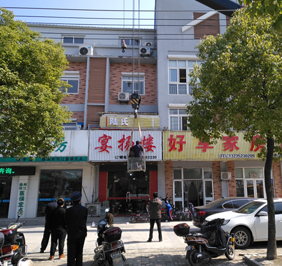 3月9日這天中午時(shí),佳家花園小區(qū)臨街商鋪前一臺(tái)大吊機(jī)正在工作著,好像在拆什么東西?走近一看原來(lái)是在拆卸商鋪外墻上鱗次櫛比的廣告招牌。隨著佳家花園小區(qū)入住率的提高,小區(qū)商戶進(jìn)駐數(shù)量逐年穩(wěn)步增加,各行業(yè)迅猛發(fā)展,種類繁多,有飯店、藥房、房產(chǎn)等等各種商戶,為小區(qū)居民就近購(gòu)物、餐飲、等等各項(xiàng)活動(dòng)帶來(lái)了極大的便利?墒窃谠谙硎苎亟稚啼亷(lái)的種種便捷與好處之余,物業(yè)注意到了商鋪林立的廣告招牌,每家商鋪的招牌或大或小,顏色字體形態(tài)各異,規(guī)格參差不齊,看起來(lái)雜亂無(wú)章,影響房屋外墻的美觀與和諧。在物業(yè)的提議下,佳家花園社區(qū)聯(lián)合城北鄉(xiāng)城管大隊(duì)前往現(xiàn)場(chǎng),對(duì)沿街商鋪統(tǒng)一整治。