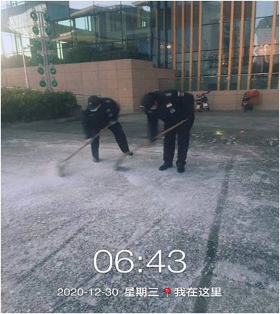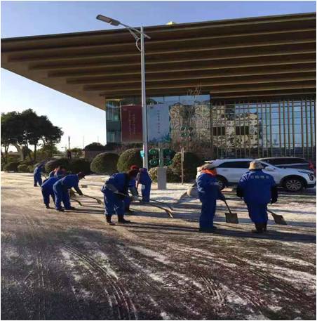 當(dāng)天夜里,在崗的物業(yè)保安人員用工業(yè)鹽逐段拋灑會議中心主干道,確保路面不因低溫而結(jié)冰。30日早7時(shí)未到,項(xiàng)目部全員上路鏟雪,加上萬楊公司運(yùn)作六部派來的8名支援會議秩序的安保人員,大家繼續(xù)拋灑融雪劑,用鐵鍬鏟的鏟、用大掃把掃的掃……8點(diǎn),會議中心東廣場已無明顯冰雪存在、京杭之心主干道路面已不再溜滑。不一會兒,參會車輛逐步駛?cè)霃V場,與會人員邁著矯健的步伐走進(jìn)會場。放下除雪工具的保安人員又開始維護(hù)車輛秩序……