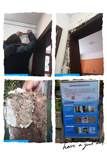 區(qū)域管家李虹知道其來意后,首先安撫其情緒,然后電話聯(lián)系揚州市白蟻防治中心,請求專家來現(xiàn)場鑒定和滅治。因為現(xiàn)在確實也是白蟻的繁殖高峰期,白蟻防治中心的人也很負責,約好今天上午來現(xiàn)場查看。上午9點左右,專家?guī)еぞ邅淼浆F(xiàn)場,發(fā)現(xiàn)該商戶的廚房門框處有白蟻的跡象,于是用工具翹開門框板,里面全是白蟻和蟲卵,看得人直起雞皮疙瘩,專家立即進行滅治,并深層注射,在一系列專業(yè)的操作后,終于徹底清除了白蟻,另外專家還向業(yè)主普及了白蟻防治的知識和注意事項和檢查方法,這下業(yè)主終于放心,連聲對物業(yè)工作人員和專家表示感謝。