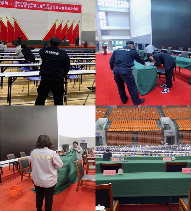 揚(yáng)州市職業(yè)大學(xué)于2021年4月18日隆重召開了第三屆第三次職工代表大會(huì),職代會(huì)是一年一度的一件大事,因此,會(huì)場(chǎng)布置對(duì)于成功舉辦此次會(huì)議起到極為重要的作用,在會(huì)議前期,江蘇萬楊物業(yè)職大項(xiàng)目部根據(jù)此次會(huì)議要求以及參會(huì)人數(shù)進(jìn)行合理布置。
