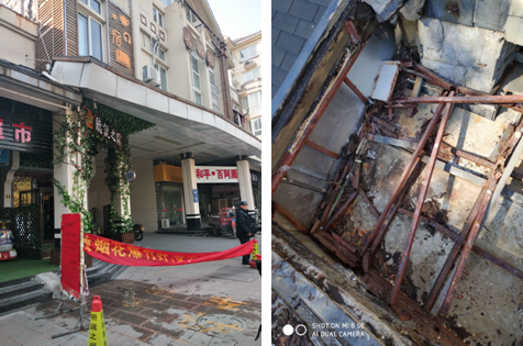 陳經(jīng)理立即通知項目寫一份友情提醒,并用橫幅拉好警介區(qū),同時,電話聯(lián)系相關(guān)專業(yè)施工人員,先來把腳手架搭建起來,抵住要脫落的門樓。待腳手架搭好后,上去查看原因,原來門樓內(nèi)的支撐角鐵因多年風(fēng)化,已銹蝕斷裂,存在較大安全隱患。