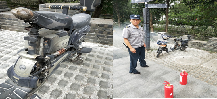 2018年9月28日下午,一輛接孩子的電動車突然開始冒煙隨即竄出火苗,這時正在附近巡查的江蘇萬楊物業(yè)工藝坊項目處保安郭黎祥看到此情況立即用對講機(jī)進(jìn)行匯報并第一時間從就近的商場消火栓內(nèi)取出兩瓶滅火器一手一個飛奔現(xiàn)場,由于平時經(jīng)常參與消防安全滅火演練,所以郭黎祥到現(xiàn)場后熟練地使用滅火器對火源根部進(jìn)行噴射,及時處置了險情。隨即郭黎祥在現(xiàn)場尋找車主,但是沒有找到。