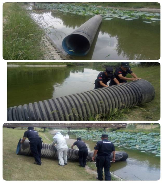 9月10日上午8點,江蘇萬楊物業(yè)城市中央公園秩序維護隊員周隊長例行巡查時,在園區(qū)兒童林北側(cè)的觀光河水面上,發(fā)現(xiàn)了一根長6米直徑60公分的排水管道,漂浮在水面上大煞風景。
