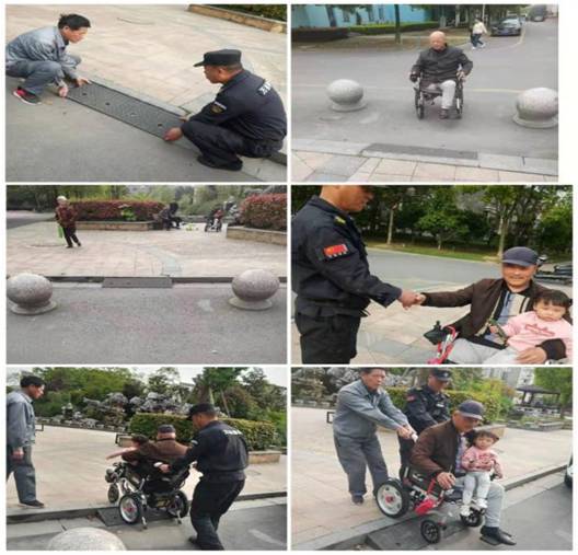 28日上午一上班,工程師傅苗建青、王建平、保安張林三人將踏步運到中心花園開始安裝。一頓操作后,坡道踏步終于安裝好了,他們便請張大爺過來試試,看看效果怎樣。張大爺騎著他的電動助殘車來到中心花園,沒費事就騎上路牙,高興地對他們說:“謝謝你們了!真的謝謝你們了!幫了我的大忙!北0矎埩窒氲街行幕▓@這邊經(jīng)常有汽車?,為防止車輛擋住這個坡道踏步,他們在附近又置放了兩個大石球,這樣一來,就更妥善了。