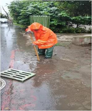 秩序部巡邏員張小平和李德仁也奔赴查看22棟、62棟和89棟之間的景觀池,防止水位上漲漫進(jìn)附近的樓棟里;消控室的胡林也沒(méi)閑著,通過(guò)屏幕密切關(guān)注著地下人防的進(jìn)、出口,如果出現(xiàn)地面有積水狀況的話,立即向秩序部隊(duì)長(zhǎng)要求增援;由于西門地勢(shì)低,沒(méi)過(guò)多久雨水就從腳裸淹沒(méi)到了小腿,秩序員門崗施殿山和周有松迅速打開(kāi)兩邊的雨水蓋,對(duì)積水進(jìn)行處理,加快排水速度,為了防止不知情的居民誤入井中,兩個(gè)不停地提醒和引導(dǎo)過(guò)路的居民,于是在雨中出現(xiàn)了兩個(gè)“守井人”。 保潔部的保潔員們則檢查各自區(qū)域的路面,盡管平時(shí)已清理了雨箅,但如今雨勢(shì)兇猛,水流川急,有的支干道難免有積水現(xiàn)象,他們用大掃帚把積水掃向雨箅口,并借大雨洗刷路牙,她們不顧雨水抽打著雙眼手不停地忙著,隨時(shí)聽(tīng)從指揮外理急情。各部門環(huán)環(huán)相扣,無(wú)縫銜接,恪盡職守著。