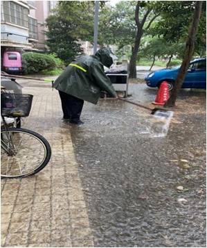 7月16日下午3點(diǎn)30分左右,揚(yáng)城迎來(lái)了今年入夏以來(lái)的最強(qiáng)暴雨。一時(shí)間狂風(fēng)大作、暴雨傾盆,突如其來(lái)的強(qiáng)降雨使得整個(gè)揚(yáng)州城都好像浸泡在水中。文昌花園物業(yè)工作人員以雨為令,紛紛丟下手中的事,按照防汛預(yù)案中的布署和分工,穿上雨衣帶上鐵鉤、鐵鍬、手電筒等工具分頭迅速行動(dòng)起來(lái)。