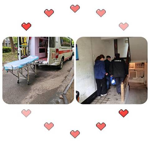 原來是34幢3樓的一戶業(yè)主,當(dāng)天剛好出院回家。救護(hù)車上只有一位陪同人員,隨著擔(dān)架車從上面推下來,因?yàn)榧覍偈敲,她有點(diǎn)犯愁,需要抬上樓人手不夠,正好這時(shí),西門崗的秩序維護(hù)員劉德山也趕過來了解情況,李虹又用對講機(jī)呼叫班長過來,主動提出幫忙將病人護(hù)送到家。