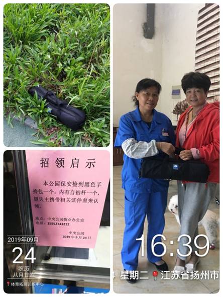 9月24日上午8點(diǎn)半,江蘇萬(wàn)楊物業(yè)廖家溝城市中央公園項(xiàng)目處客服劉玥剛上班,就收到車(chē)巡崗隊(duì)員金海山送來(lái)的一個(gè)黑色手提袋子,并告知是保潔曹如婥在區(qū)域打掃時(shí)撿到的,早晨7點(diǎn)左右,車(chē)巡崗隊(duì)員董學(xué)虎、金海山在園區(qū)巡邏至人才公園東門(mén)崗?fù)ぬ帲龅揭晃或T著電動(dòng)車(chē)的中年婦女,急匆匆的問(wèn)有沒(méi)有看到一個(gè)黑色的小拎包,由于當(dāng)時(shí)并沒(méi)有發(fā)現(xiàn)該物品,中年婦女問(wèn)完很快離開(kāi)了,也沒(méi)來(lái)得及留下個(gè)聯(lián)系方式....