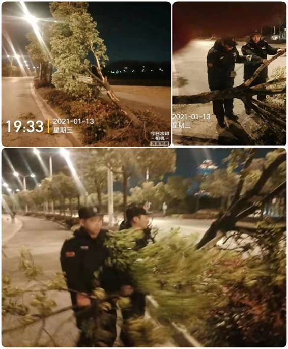 行道樹(shù)橫倒機(jī)動(dòng)車(chē)道,雖說(shuō)是園區(qū)物業(yè)服務(wù)區(qū)域外的安全隱患,但江蘇萬(wàn)楊物業(yè)本著“精心管理,全心服務(wù)”的理念和宗旨,項(xiàng)目經(jīng)理韋長(zhǎng)英還是果斷要求晚班隊(duì)員,“快捷、高效”地排除隱患。由于倒地的行道樹(shù)太大、太沉,車(chē)巡崗兩名隊(duì)員一時(shí)無(wú)法移動(dòng);于是,田桂龍班長(zhǎng)立即通過(guò)對(duì)講平臺(tái)呼叫其他崗?fù)戆嗤略鲈,通過(guò)大家齊心協(xié)力,把大樹(shù)挪到了綠化帶中間部位,并對(duì)礙事的樹(shù)枝進(jìn)行了修理剪截,確保機(jī)動(dòng)車(chē)和非機(jī)動(dòng)車(chē)道的暢通。