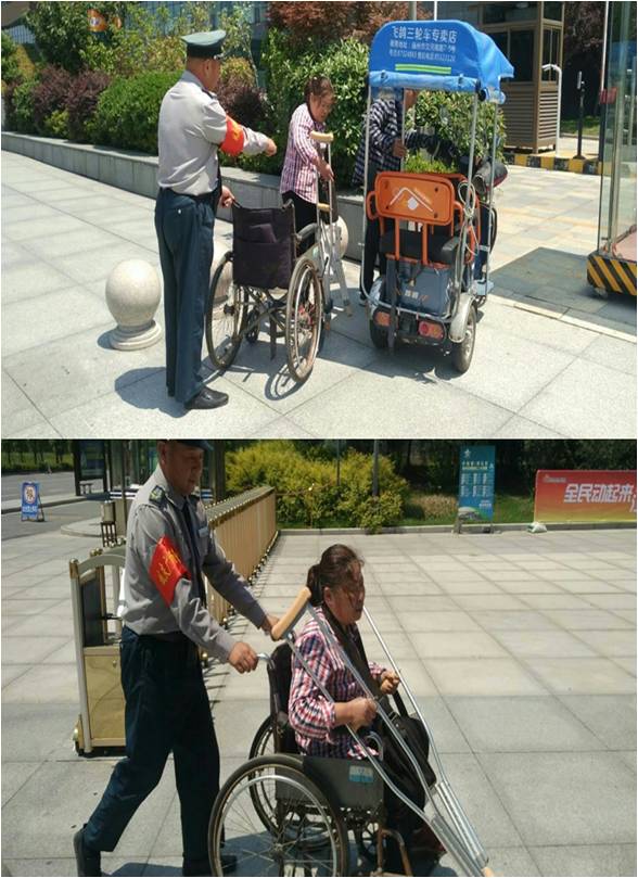 老徐讓隊友先頂替一下自己的崗位,他跟老婦小聲地說了什么,老人不再焦急了。隨即老徐拿下代步車上的輪椅,又小心地把她從代步車上攙扶下來,坐進輪椅。頂著炎炎烈日,老徐把殘疾老婦人緩緩?fù)葡驈V場,向2號樓的方向走去。老人臉上露出了開心的笑容,連聲向老徐致謝……