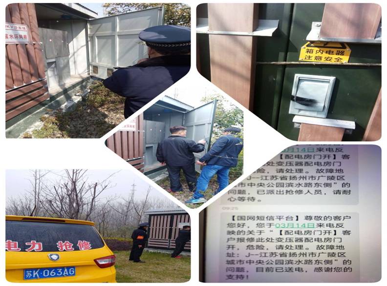 2018年3月14日上午9點左右,保安班長嚴長國、車巡隊員方德元,例行巡查至濱水路東側(朱家河閘站北),發(fā)現(xiàn)一組高壓電箱柜門大開,不設防的電器設備、裸露電纜接頭,存在著極大的安全隱患。社會人員,特別是問題人員不慎進入接觸,都有可能造成嚴重的后果。于是隊員將情況通過項目工作群進行了通報。物業(yè)負責人收獲信息后立即進行了核實查詢,確認該處高壓電柜是由揚州市電力部門統(tǒng)一管理的,物業(yè)沒有鑰匙柜門無法關閉。