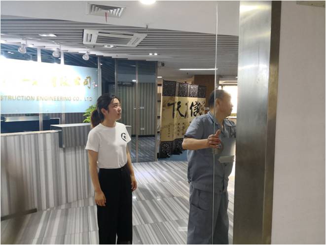 工程侯師傅對著門鎖研究、推敲了一番,終于發(fā)現(xiàn)了問題,原來是門上面的軌道出現(xiàn)了問題而導(dǎo)致門卡住了,只要把門移動到軌道上應(yīng)該就能夠打開。雖然問題看上去很簡單,可是玻璃門好重,客服人員和業(yè)主合力也弄不動,這時正好被在樓層上巡邏的保安隊長看見,大家一起合力終于把門移動到原來的軌道上了。門終于開了,業(yè)主露出了滿意的笑容,連聲對物業(yè)的管理人員表示感謝。