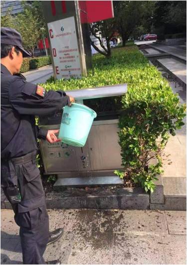 原來(lái),這股煙是從11號(hào)樓門(mén)口一個(gè)垃圾桶里面冒出來(lái)的,到了近處時(shí),煙已經(jīng)越來(lái)越大,他趕緊用對(duì)講機(jī)呼叫隊(duì)長(zhǎng)褚廷衛(wèi)匯報(bào)情況,然后奔跑到最近的有水源的地方,取來(lái)水進(jìn)行初期滅火,此時(shí),在對(duì)講機(jī)聽(tīng)到情況的項(xiàng)目經(jīng)理貝宏波和隊(duì)長(zhǎng)褚廷衛(wèi)也拿著滅火器趕到了現(xiàn)場(chǎng),在三個(gè)人的努力下火源很快被滅掉了。