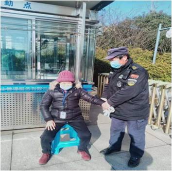 這一幕發(fā)生在城慶廣場(chǎng)西門崗,事發(fā)的起因是當(dāng)時(shí)正在崗?fù)ぶ蛋嗟闹刃騿T朱道龍看到一位佝僂身軀行動(dòng)不便的老太太東張西望,眼里還噙著淚水,在自言自語,于是隊(duì)員朱道龍立即上前詢問情況,但因?yàn)槔先四昙o(jì)較大口齒不清自己也不知道怎么就走到了這里。不遠(yuǎn)處就是馬路,為了防止老人發(fā)生意外,朱道龍就將老人攙扶到崗?fù)ぬ幮菹,并遞上溫水安撫老人。
