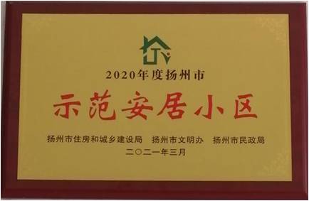 2020年,揚(yáng)州市住建局、揚(yáng)州市文明辦、揚(yáng)州市民政局三部門聯(lián)合出臺(tái)《關(guān)于在全市開展文明安居小區(qū)創(chuàng)建活動(dòng)實(shí)施意見(jiàn)》,致力打造文明祥和的保障房小區(qū),切實(shí)提高居住群眾的獲得感、安全感和幸福感。 佳家如意園項(xiàng)目部緊緊圍繞著“幸福家園、共建共享”主題,積極開展文明安居小區(qū)創(chuàng)建活動(dòng),經(jīng)過(guò)自主申報(bào)、實(shí)地考察等評(píng)選程序。2021年3月30日下午,在市住房和城鄉(xiāng)建設(shè)局會(huì)議室召開推進(jìn)2021年創(chuàng)建文明安居小區(qū)工作會(huì)。會(huì)議上表彰了保障房小區(qū)“2020年度揚(yáng)州市示范安居小區(qū)”榮譽(yù)稱號(hào)。佳家如意園項(xiàng)目部榮獲2020年“揚(yáng)州市示范安居小區(qū)”榮譽(yù)牌。