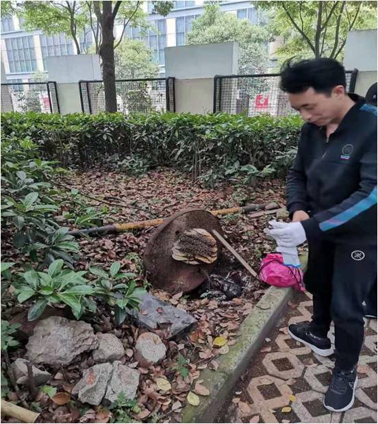 說干就干,徐隊(duì)長(zhǎng)當(dāng)即聯(lián)系了養(yǎng)殖蜜蜂的張師傅來到現(xiàn)場(chǎng),據(jù)介紹,蜜蜂一般不會(huì)攻擊人類,了解蜜蜂習(xí)性的張師傅只佩戴了一雙手套,拿個(gè)袋子,小心翼翼的撬開管道井,不到一分鐘的時(shí)間就安全的清理了蜂巢。解除了安全隱患。