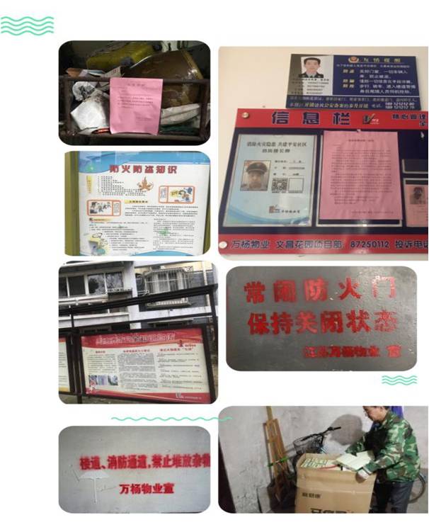 隨后物業(yè)制定完善了應(yīng)急救援預(yù)案、定期組織應(yīng)急演練,推行“樓長(zhǎng)”制度。又在樓道信息欄內(nèi)張貼警示標(biāo)語(yǔ),提醒居民們不要在公共區(qū)域堆放雜物、停放電動(dòng)車(chē)及充電。宣傳欄里圖文并茂普及防火、滅火和逃生自救的知識(shí),引導(dǎo)居民們關(guān)注身邊的火災(zāi)隱患,杜絕起火源頭,提高居民們消防安全意識(shí)和自我自救能力水平。(江蘇萬(wàn)楊物業(yè)文昌花園項(xiàng)目部 俞莉莉)