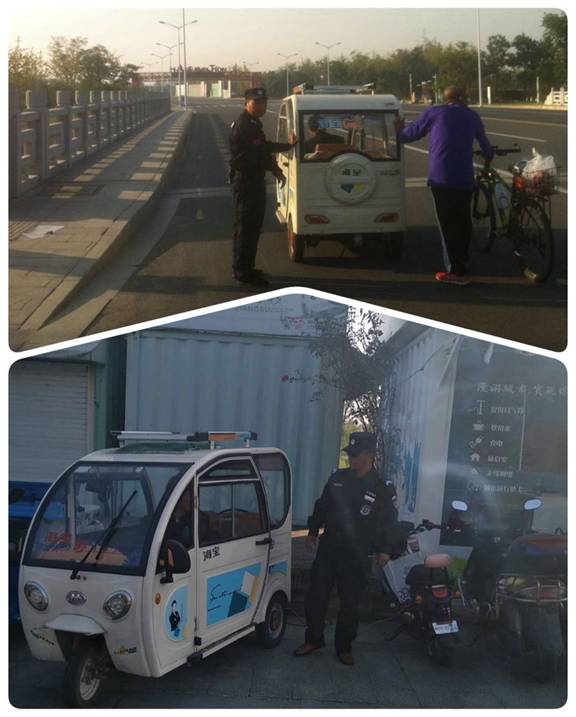 10月2日上午7時38分,江蘇萬楊物業(yè)中央公園3號崗?fù)ぬ,一輛電動小三輪車緩慢的停在崗?fù)ね猓唭?nèi)車主不時的向在崗?fù)?nèi)隊員招手示意。