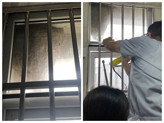 接到求助后,物業(yè)工程師傅準(zhǔn)備好了不銹鋼桿、殺蟲劑等物品,戴好口罩,做好防護(hù)措施,立刻和客服人員來到1401業(yè)主家中幫忙清理?头藛T先慢慢打開窗戶,工程師傅用殺蟲劑對(duì)馬蜂窩進(jìn)行噴灑,然后小心翼翼地用不銹鋼桿鏟掉馬蜂窩,經(jīng)過一個(gè)小時(shí)的努力,這個(gè)“定時(shí)炸彈”被成功鏟除。最后在馬蜂筑巢處四周全部噴灑上殺蟲劑,防止飛走的馬蜂在回來重新筑巢。