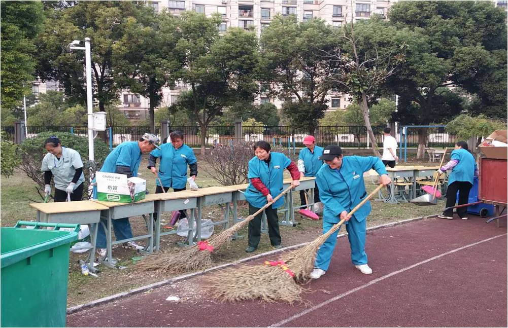 隨著發(fā)令員的一聲槍響,運動會開始了。參賽隊員揮汗如雨的比拼著,啦啦隊員們高聲吶喊著,歡呼著,孩子們在興奮的同時把飲料瓶、花生瓜子殼及各種垃圾隨手都扔到了草坪和塑膠跑道上,現(xiàn)場人數(shù)多,流動性大,保潔班組的員工們有條不紊、不厭其煩的打掃著每人分包的衛(wèi)生區(qū)域,任灰塵沾滿臉頰、汗水濕透衣裳,但是沒有一句抱怨。哪里有垃圾,哪里就有他們的身影和勞動的笑聲。他們將運動場主門到場內(nèi)每一個角落都打掃的干干凈凈,不放過每一個細微之處。不僅是保潔班組,兩位項目負責人也加入了打掃“戰(zhàn)場的隊伍,瘦小的吳經(jīng)理拿著比她還高的大掃帚,掃著地上散落的垃圾,佘經(jīng)理在后面幫忙拉著裝滿垃圾的桶,兩人不停的忙碌著,時間如梭,運動場上潔凈一片,兩旁的草兒點頭微笑地歡送著他們離開的身影,這時天已經(jīng)黑了。偌大的運動場只剩下一群忙碌著的萬楊人的身影。