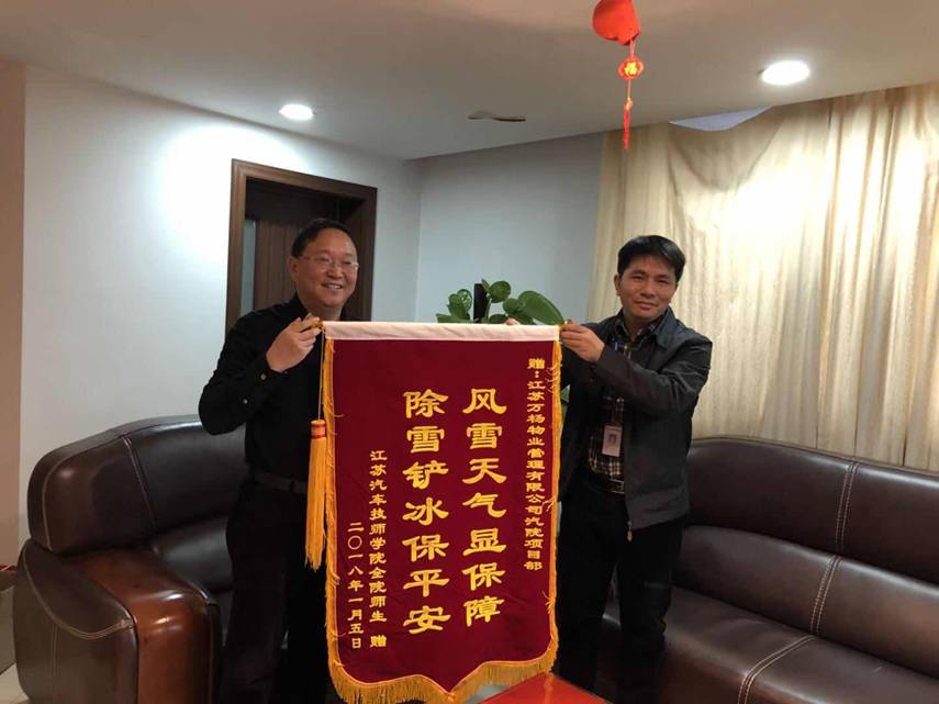 功夫不負(fù)有心人。2018116日陰雨綿綿,寒風(fēng)襲人,華遠國際大廈501室人頭躦動,熱鬧非凡,江蘇汽車技師學(xué)院領(lǐng)導(dǎo)一行幾人為對合作工作多年的江蘇萬楊物業(yè)管理有限公司的工作成績給予肯定和勉勵,代表全體師生給萬楊物業(yè)送來錦旗。