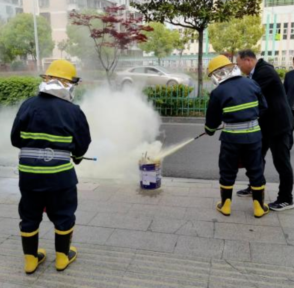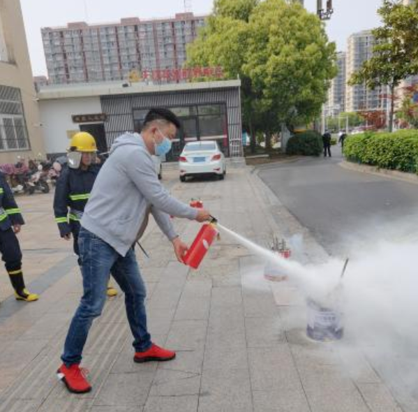 隨后,現(xiàn)場(chǎng)物業(yè)消防人員和部分業(yè)主對(duì)滅火器的使用方法進(jìn)行了演示,他們提起滅火器瓶反復(fù)顛倒幾次、拔去鉛封和保險(xiǎn)銷、站在火焰上方位置左握噴管右提壓把,瞄準(zhǔn)火焰根部噴射。