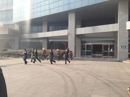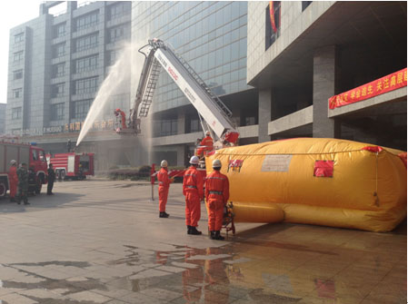九點(diǎn)整,所有參加演習(xí)的消防官兵方正、公司安保隊(duì)員及管理人員方正、參與演習(xí)被困人員方正全部整齊列隊(duì),等待總指揮一聲令下,全都井然有序的各就各位,開始了正式演習(xí)。501室的窗口濃煙直冒,消防車及時(shí)趕到樓下,一輛車開始對幕墻噴淋,一輛高空救援車停在了窗下,我們的救援車將消防員送達(dá)到五樓,將被困人員安全的救了下來,還有一部份人員在其他消防員的引導(dǎo)下從安全通道有序的逃生成功。