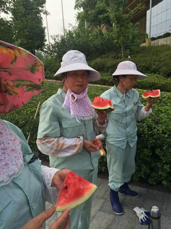 夏季高溫酷熱,從7月開始,最高氣溫經常達到35℃以上。萬楊物業(yè)服務中保潔、秩序維護、工程維修、綠化養(yǎng)護等一線員工戶外工作時間較長,為保證服務質量,關心員工健康,根據中心《關于做好高溫天氣防暑降溫工作的通知》要求,結合往年使用情況及項目實際需求,公司在6月份就購置了一批防暑物品,包括十滴水、龍虎人丹、清涼油、毛巾、香皂、大麥茶等,第一時間發(fā)放到各項目處,并要求督促員工堅持服務人丹,每天給員工泡大麥茶,項目處堅持送茶到崗服務,確保員工充分補充水份,條件允許的項目還定期購買西瓜、冷飲,各種措施均得到了員工的廣泛好評。
